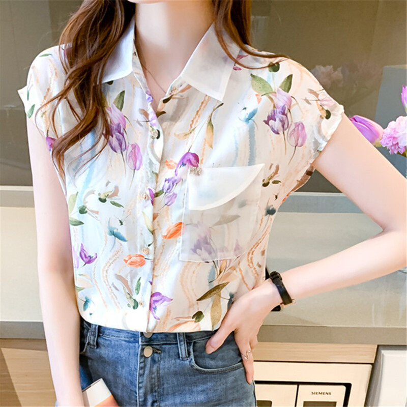 Casual Shirt Women Korean Style Plus Size Loose Top Chiffon Short Sleeve Floral Blouse Summer Shirts