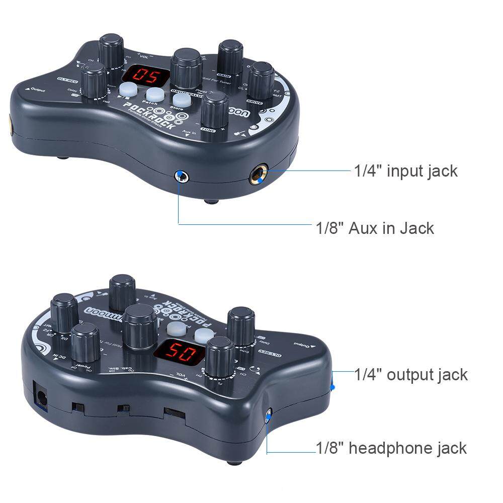 ammoon PockRock is a portable guitar multi-effects pedal. 5 effect modules with 15 effect types, 40 drum rhythms, 16 preset patches and 16 user patches. It is not only a sound library, but also allows you to create your own sound library. With headphone out and AUX in, you can enjoy your playing at night and no need to worry about disturbing others.